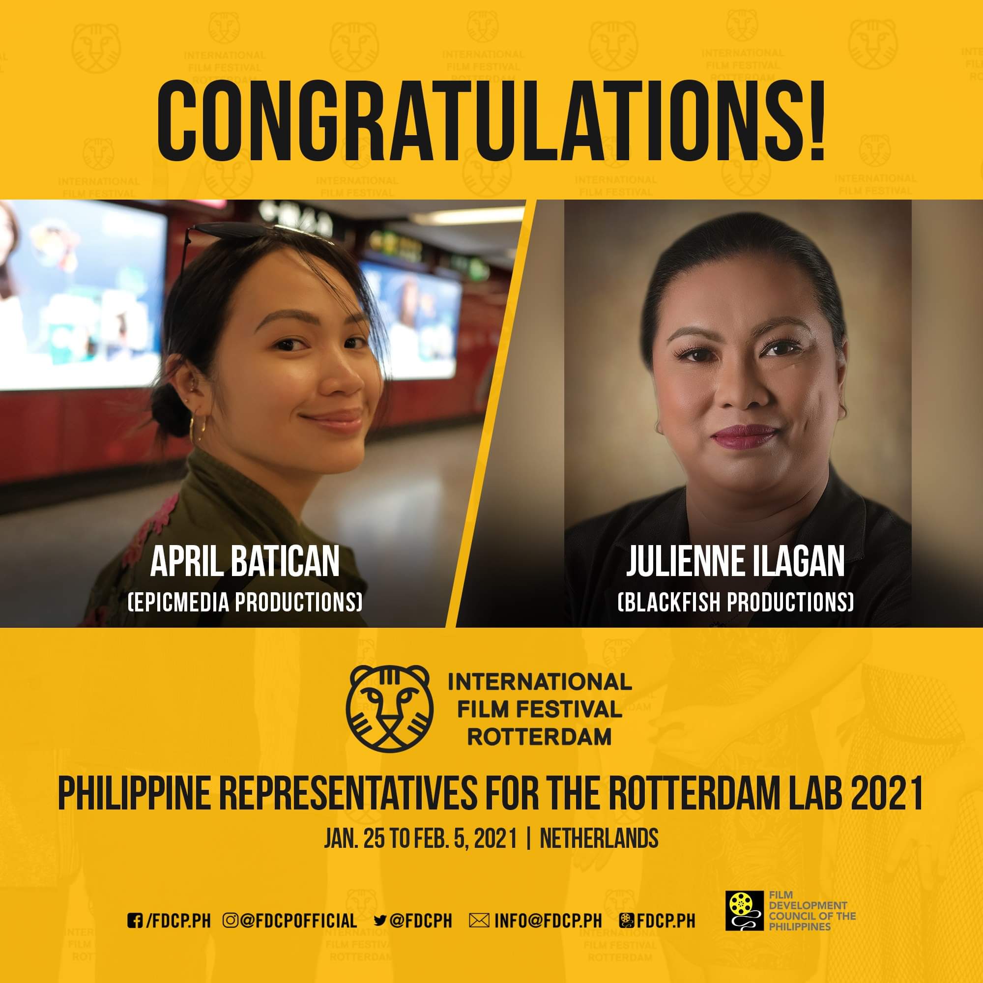 April Batican from Epicmedia Productions, Inc. and Julienne Ilagan from Blackfish Productions will take part in the international training and networking for selected up-and-coming producers from around the world in Rotterdam Lab 2021 that will be held from January 25 to February 5.