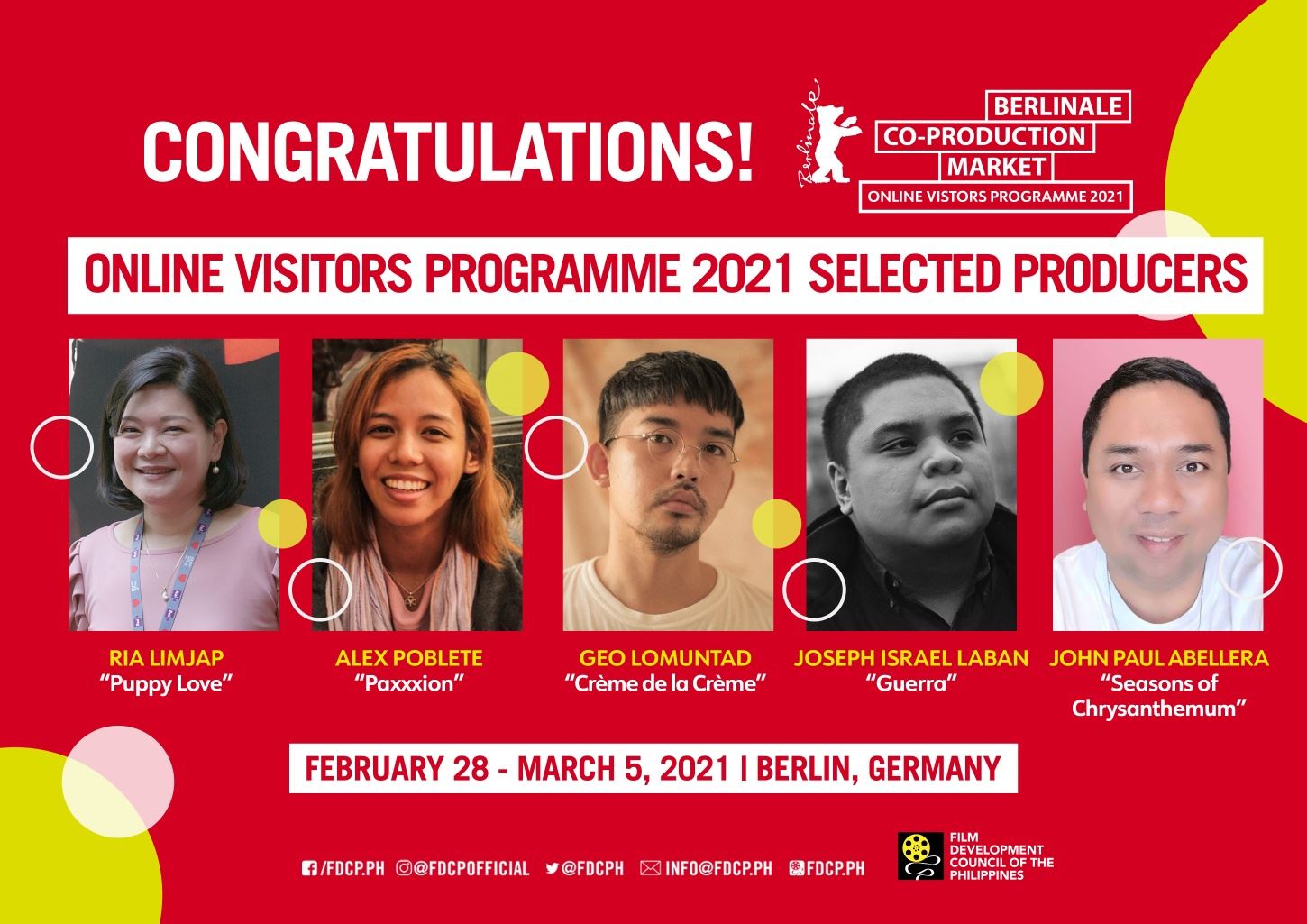 MANILA, PHILIPPINES, FEBRUARY 25, 2021 — Five producers with projects in development who wish to pursue international co-productions will represent the Philippines in the Online Visitors Programme of the 18th Berlinale Co-Production Market at the 71st Berlin International Film Festival in Germany.
