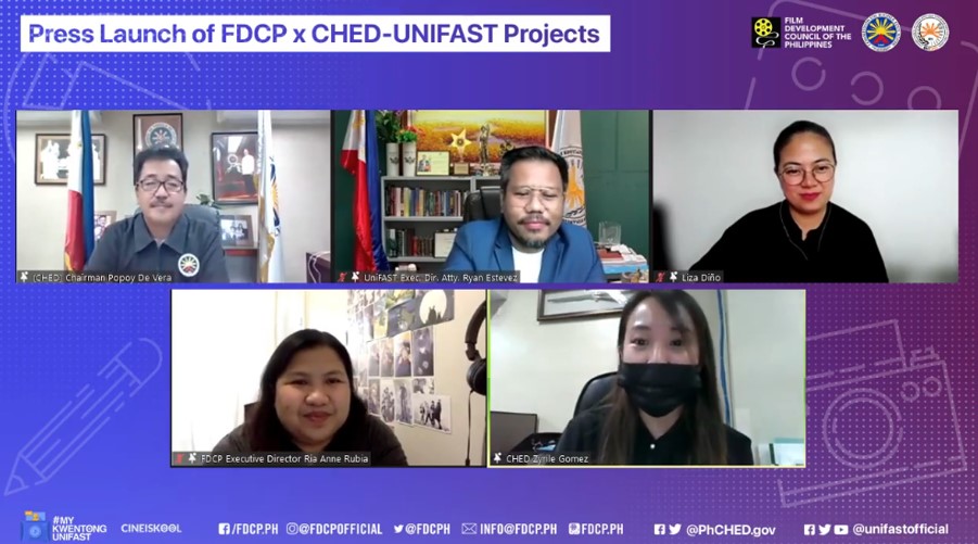 In a virtual press launch, the short film lab project dubbed as CineIskool Short Film Lab and Festival and the #MyKwentongUniFAST webinar series were presented to the members of the media led by CHED and UniFAST Board Chairman Popoy De Vera and FDCP Chairperson Mary Liza Diño.