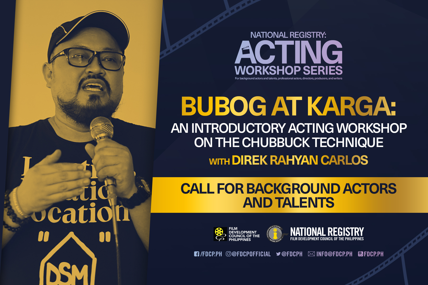 The registration for the “Bubog at Karga: An Introductory Acting Workshop on the Chubbuck Technique” for background actors and talents will be from January 5 to 23. Applicants must be registered with the FDCP NRAW. Interested participants may register and create their account through this link: https://nationalregistry.fdcp.ph/steps-to-apply/nraw.