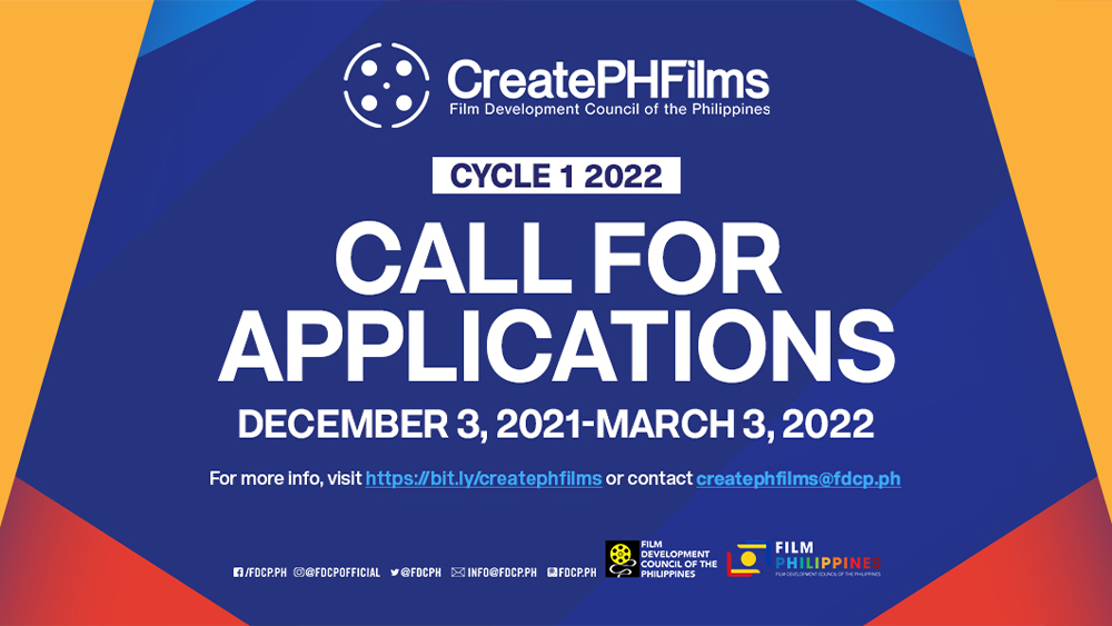 MANILA, PHILIPPINES, DECEMBER 14, 2021 — In continuing its support to the development of quality Filipino films, CreatePHFilms, the film funding program of the Film Development Council of the Philippines (FDCP) returns with another cycle to provide assistance to Filipino filmmakers in the development and production of their films.