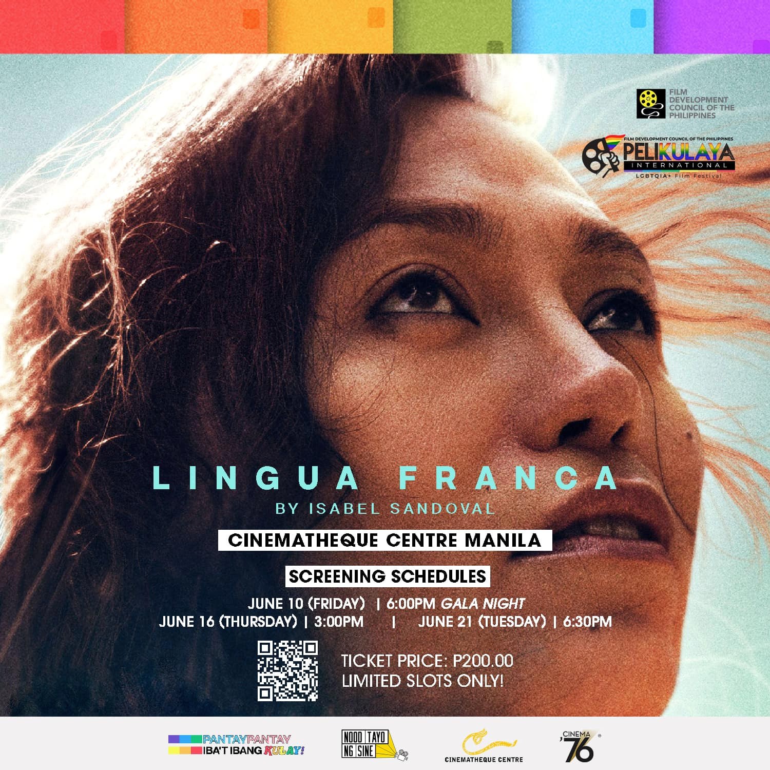 “Every year we are on the lookout for the best films that we can offer to our audiences, and for this year’s PeliKULAYa, we hope that this film, Lingua Franca, which is made by Filipina filmmaker Isabel Sandoval, will reflect the significance of Pride Month, not only for the members of the LGBTQIA+ community, but also as Filipinos. We ask for the support of audiences and aspiring filmmakers to celebrate with us by participating in the activities in this year’s lineup,” said FDCP Chairperson and CEO Liza Diño.
