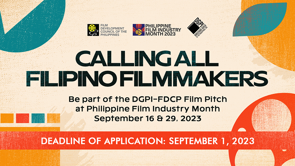 MANILA, PHILIPPINES, 29 AUGUST 2023 — To create opportunities for filmmakers to collaborate with industry leaders and financiers for the development of their film projects, the Directors’ Guild of the Philippines, Inc. (DGPI) partners with the Film Development Council of the Philippines (FDCP) for the DGPI-FDCP Film Pitch, which will be held on September 16 and 29 during the celebration of the Philippine Film Industry Month (PFIM).