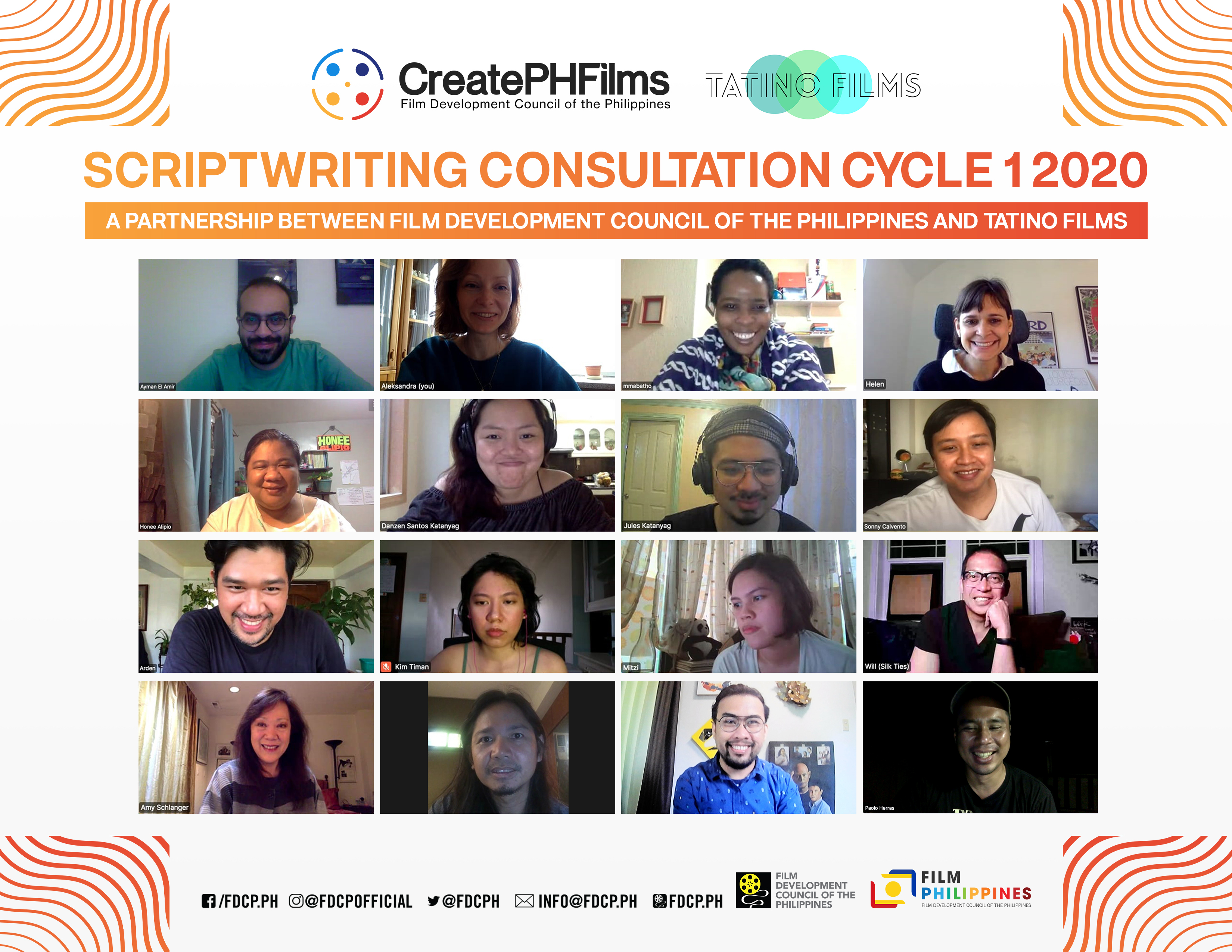 The 1st CreatePHFilms Session of Online Script Consultations, held by the FDCP in partnership with French production and consultancy company Tatino Films, featured one-on-one consultations involving script consultants Matthieu Daras, Ayman El Amir, Helen Beltrame-linné, Mmabatho Kau, and Aleksandra Świerk and the filmmakers of the eight grantees: